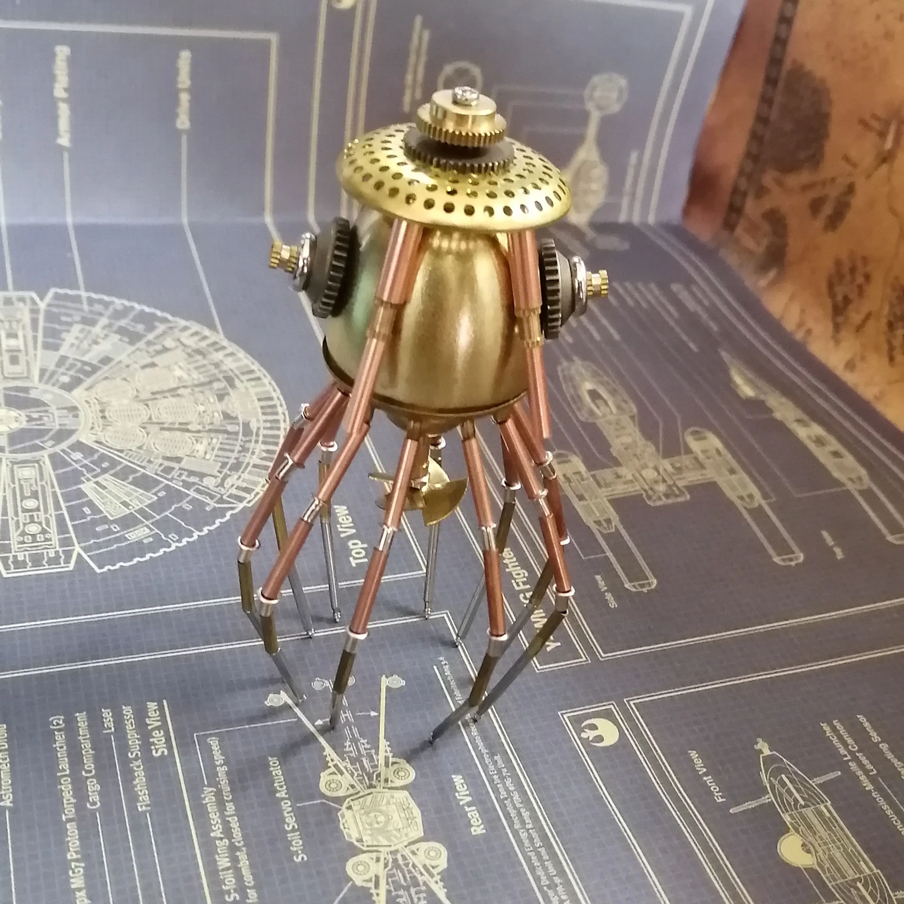 A jellyfish shaped steampunk wind mechanical is a unique and imaginative piece of art that combines the organic, flowing form of a jellyfish with the industrial aesthetic of steampunk.