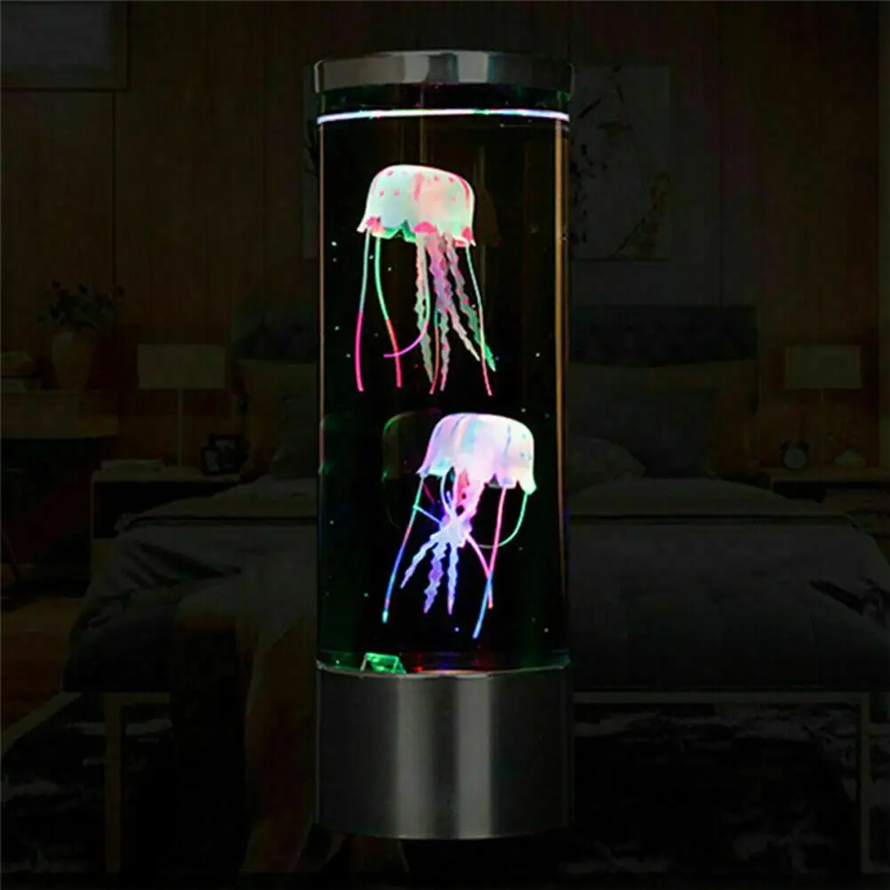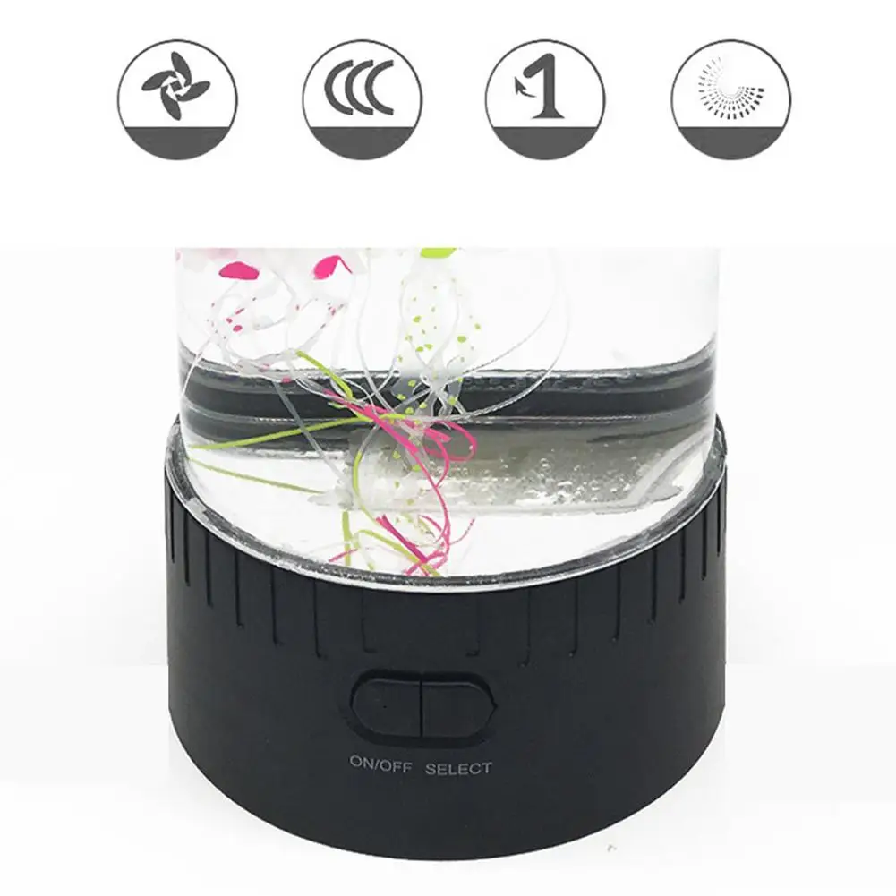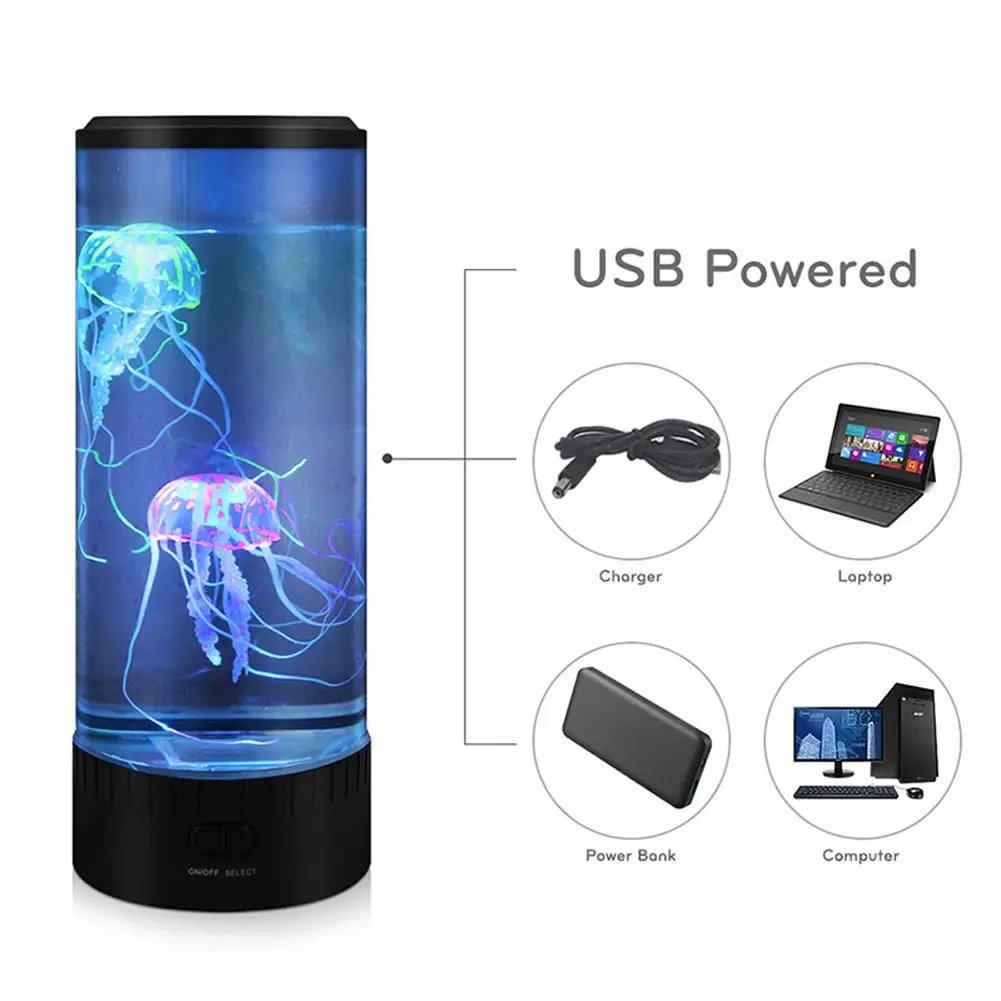 The lamp features a cylindrical tank filled with colorful LED lights and artificial jellyfish that float and sway inside. The lamp is powered by a USB cable and can be easily charged for use anywhere.