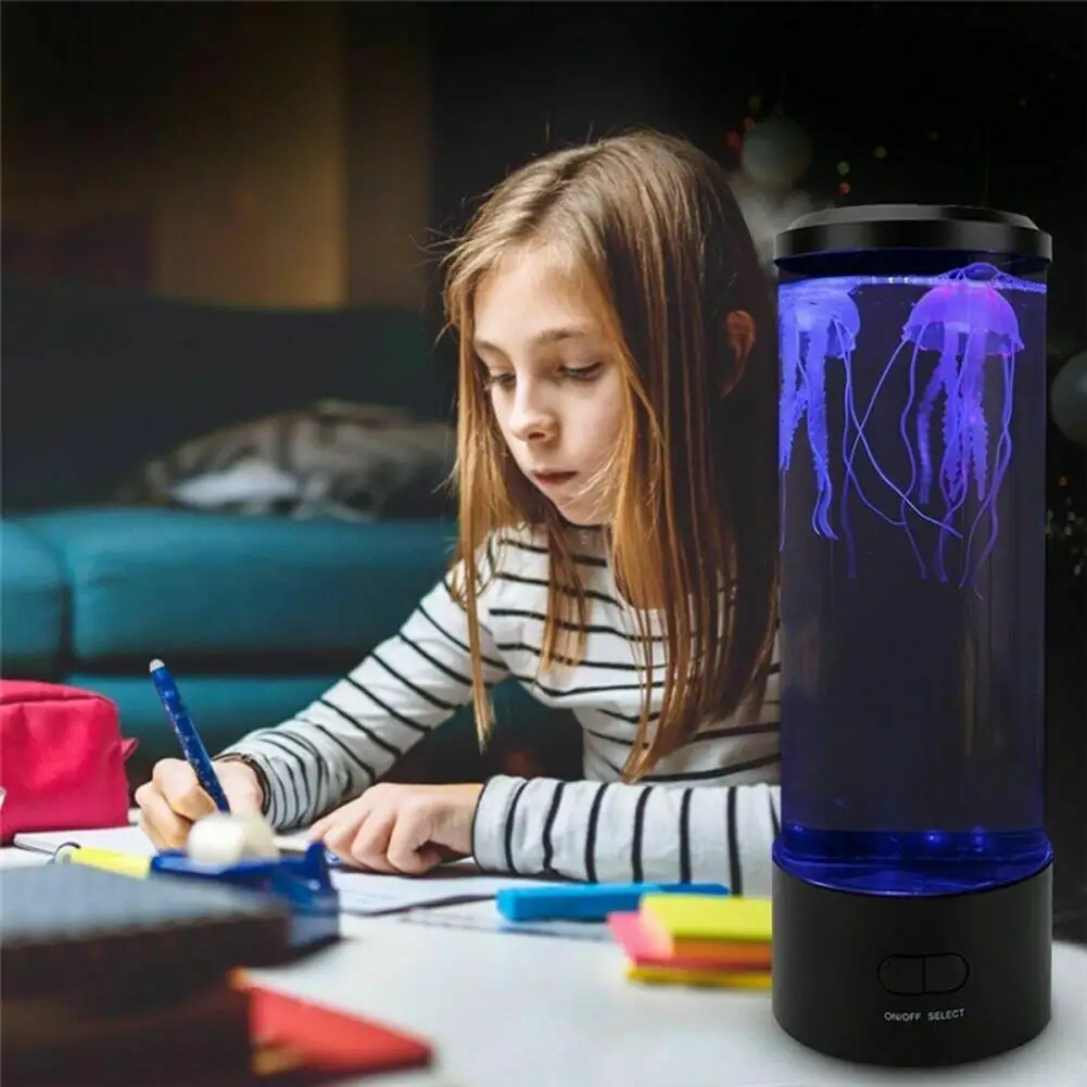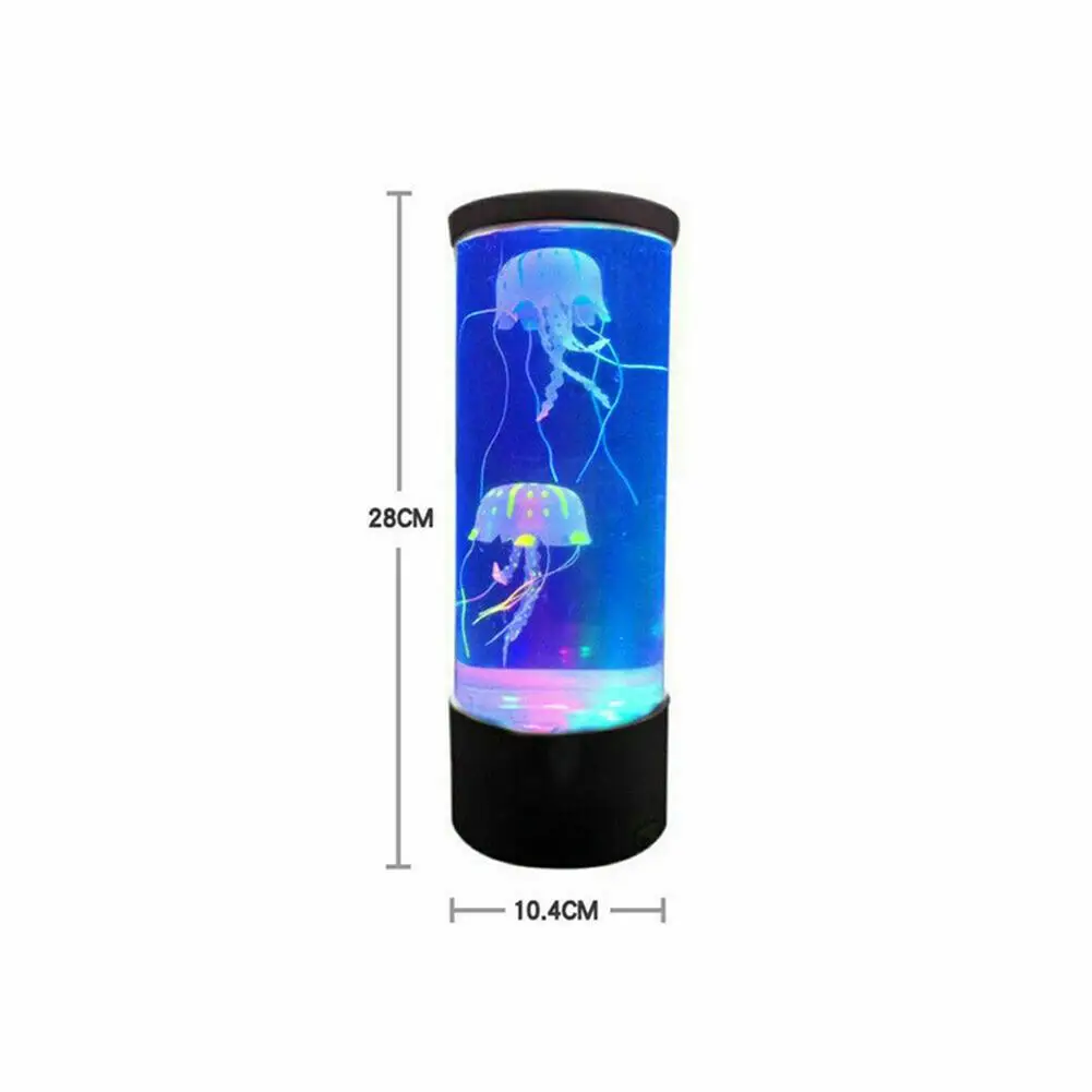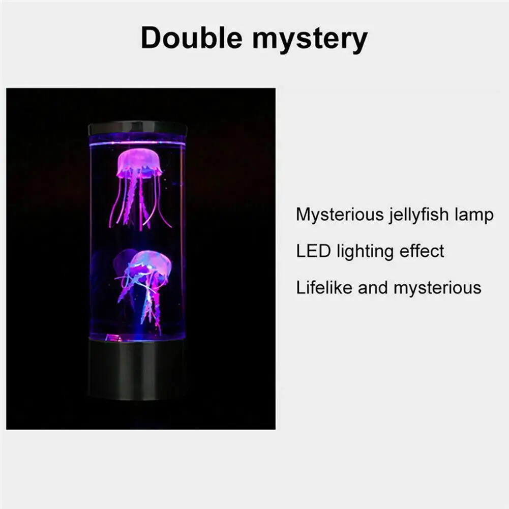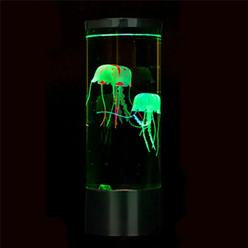 The lamp features a cylindrical tank filled with colorful LED lights and artificial jellyfish that float and sway inside. The lamp is powered by a USB cable and can be easily charged for use anywhere.